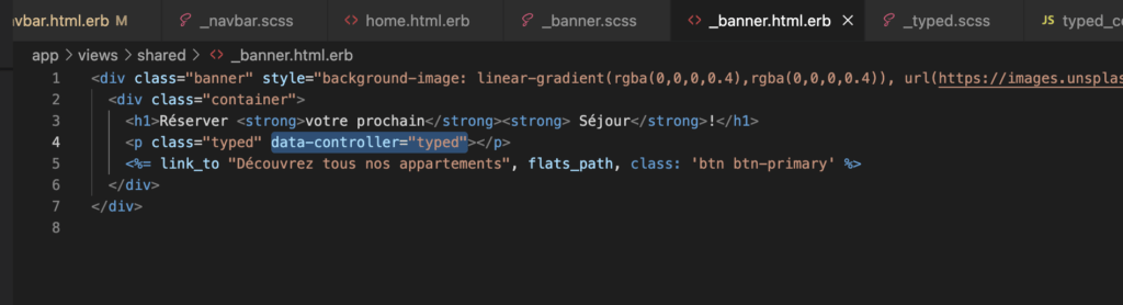 Nous devons alors ajouter cet attribut à la balise de notre choix dans notre fichier view afin de pouvoir l’afficher sur le front de notre application. Dans mon cas, nous sommes sur le fichier _banner.html.erb :